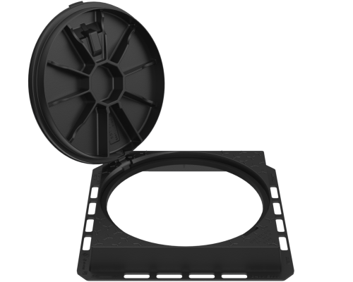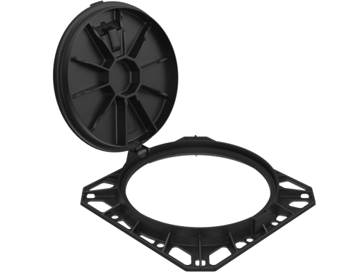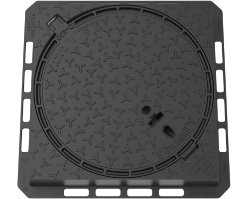 Set with clear opening 705mm. Hinged cover with safety blocking at 100˚angle and removable from the frame at 90˚. Closing with interlocking perimeter edge. Opened by standard tools (crowbar, pick). Customization available. Opening force below 54 daN.