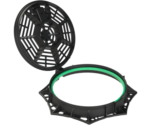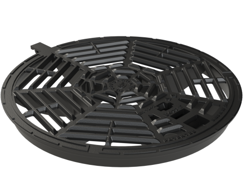 Conjunto con cota de paso Ø 604 mm. Reja articulada con apertura a 110º y dotada de bloqueo contra cierre accidental a 90º. Extracción de reja a 90º. Marco provisto de una junta diseñada a especialmente para asegurar un perfecto asentamiento e insonorización. Altura de marco 100 mm. para asegurar una instalación robusta en calzadas. Cierre por enclavamiento con faldón perimetral. Diseño de barrotes para obtener grandes capacidades de absorción y cumpliendo con la norma PMR. Con una fácil apertura mediante útiles de obra.