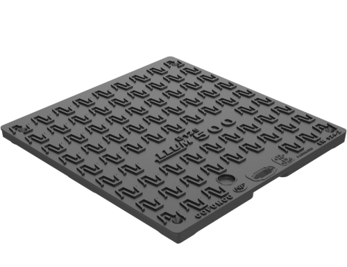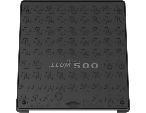 Registros cuadrados con marco hidráulico. Tapa semi-articulada con una posición de apertura estable a 105º, provista de sistema de guiado para la maniobra de cierre (abatimiento) que deja la tapa perfectamente centrada dentro de su marco. La tapa va provista de un nervio perimetral para producir el efecto de cierre hidráulico con el marco, así como de una ranura para facilitar su levantamiento. Marco con diseño especial de la zona inferior de las patas para su perfecto asentamiento. Superficie con grabado antideslizante. Posibilidad de personalización.