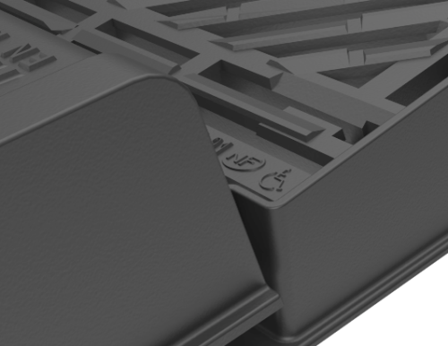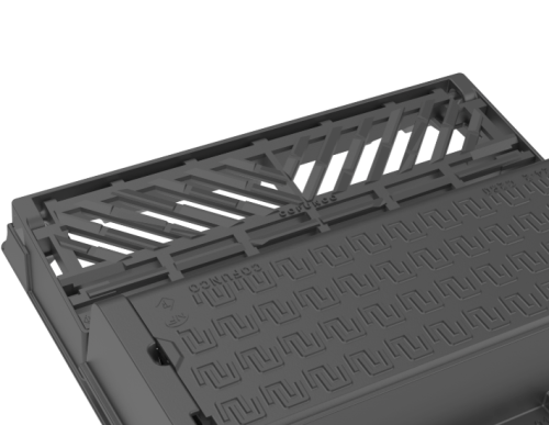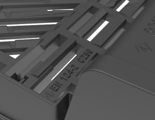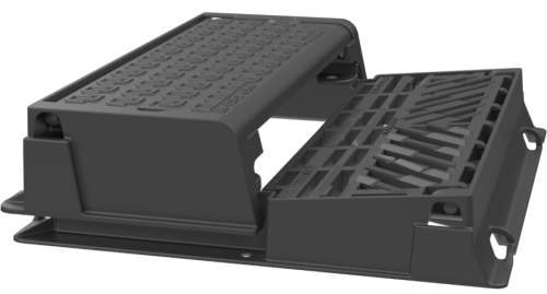 Avaloir avec grille articulée et verrouillable par barreaux élastiques. Ouverture de la grille et de l'avaloir à 110º laissant une ouverture libre de 337 mm. Possibilité d'ouvrir seulement l'avaloir pour nettoyer les déchets. Surface d´avalement = 13,5 dm2.