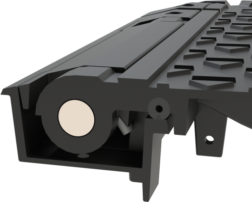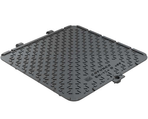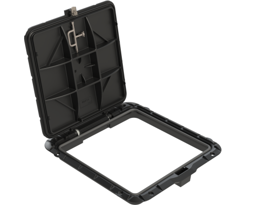 Właz z pokrywą na zawiasie, z zamkiem antywłamaniowym i kluczem, jako standard. Łatwość podnoszenia pokrywy za pomocą sprężyn zainstalowanych w zawiasach. Max. otwarcie pokrywy do 110˚. Blokada i możliwość wyjęcia pokrywy w 90˚. Powierzchnia pokrywy lekko wypukła. Korpus wyposażony we wkładkę amortyzującą.