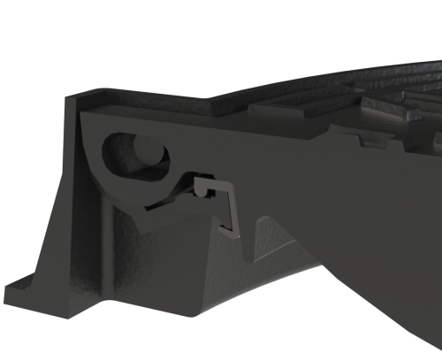 Zestaw wyposażony w wysokowydajną ciągłą wkładke elastomerową pochłaniającą drgania i zapewniającą izolację akustyczną. Rama zapewnia maksymalne mocowanie do nawierzchni. Pokrywa na zawiasach z maksymalnym zakresem otwarcia 110º, blokadą bezpieczeństwa pod kątem 90º i zdejmowana z ramy pod kątem 90º. System zamykania z blokującą krawędzią obwodową. Możliwość całkowitego lub częściowego dostosowania. Siła otwierania poniżej 30 daN.